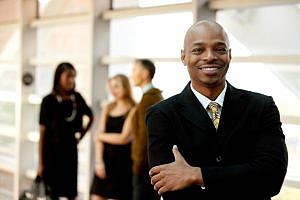 A happy black business man with people in the background